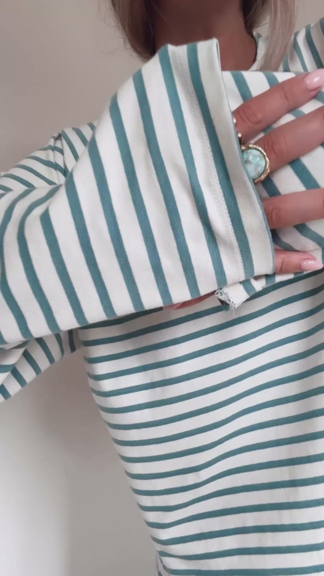 Meet our newest lounge top - an oversized boxy full length top that is easy to layer. Made from a super soft, breathable and light weight cotton/spandex blend. Yarn dyed stripe in a dusty Aegean blue/green + natural cotton.   A staple in a cool fashion forward  silhouette.